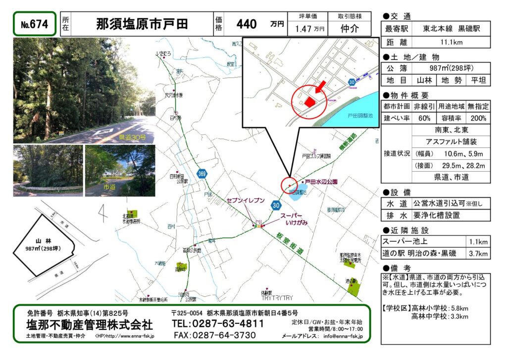 横断道路(県道30号線)沿いにあり、道路を挟んだ向かい側に戸田水辺公園があります。那須高原へもアクセス便利です。公営水道引込可。