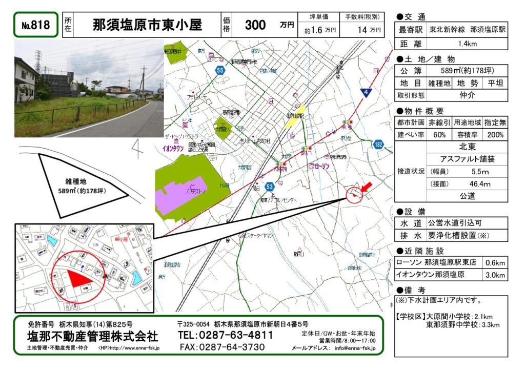 国道4号線(那須塩原駅入口交差点)から1.0km、近隣にスーパー、コンビニ、郵便局等があり生活に便利な場所です。公営水道引込可、大原間小学校・東那須野中学校区。