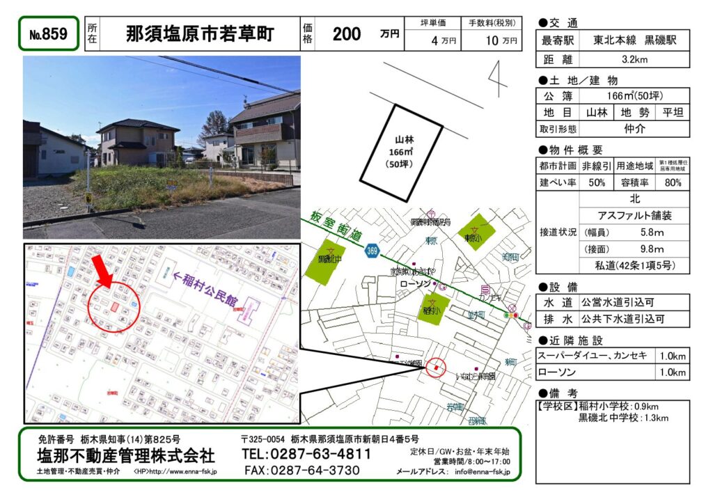 板室街道(県道369号線)から0.8km、稲村小学校・黒磯北中学校区。