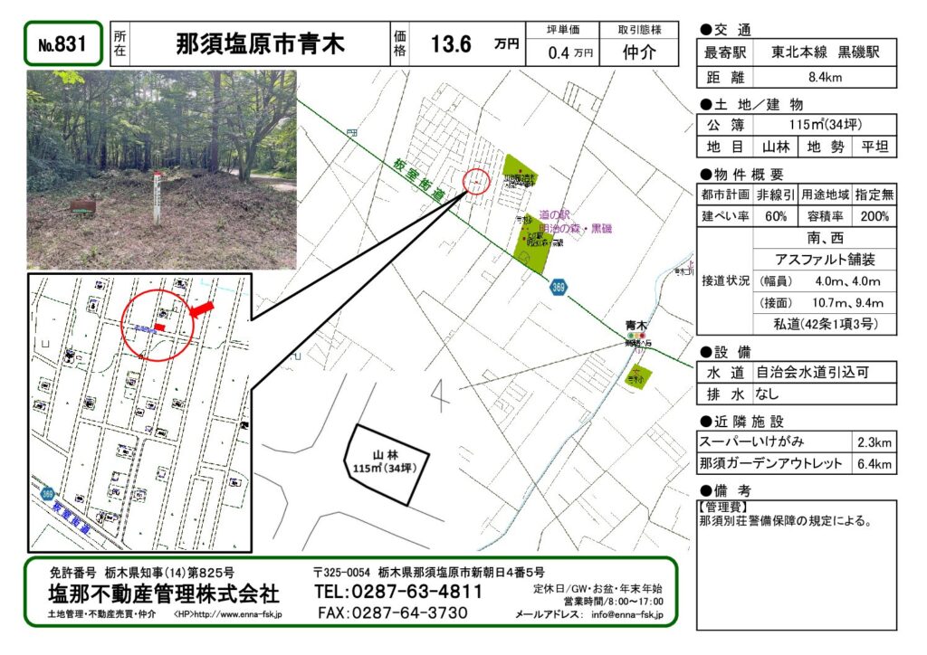 | 周辺環境 | 道の駅 明治の森・黒磯: 0.9km/ セブンイレブン: 2.3km/ スーパーいけがみ: 2.3km/ 那須ガーデンアウトレット: 6.4km | ||