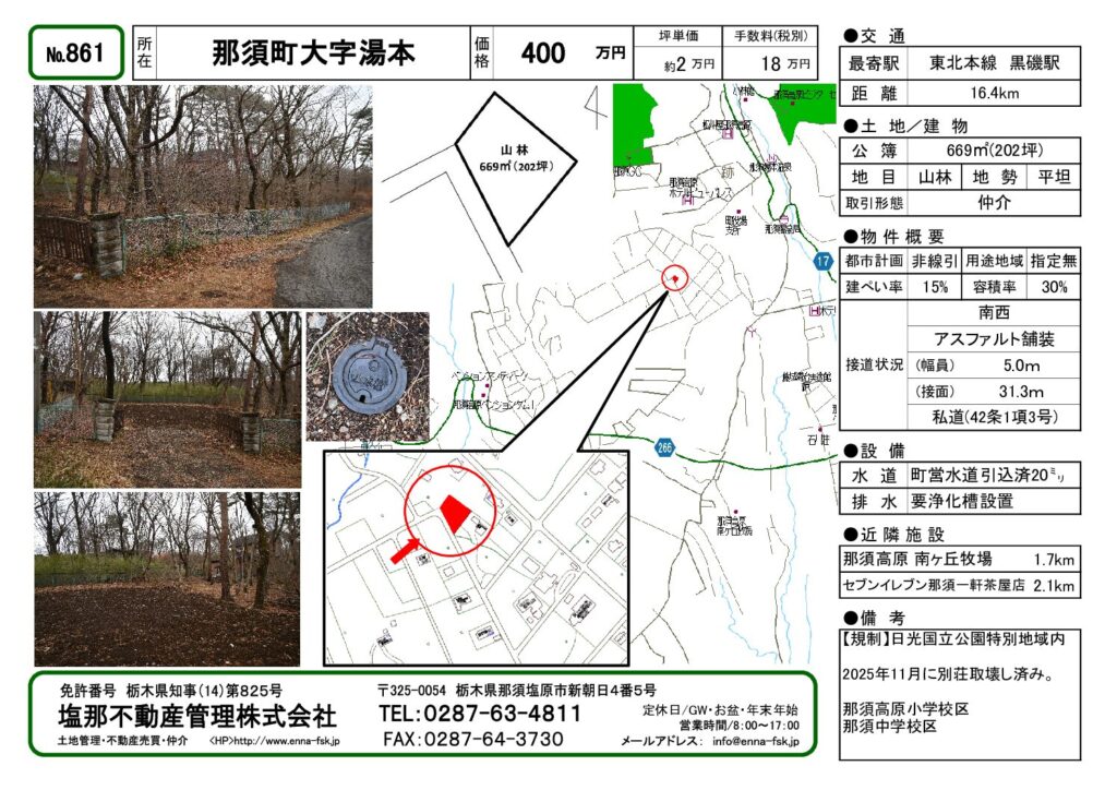 | 設備・条件 | 公営水道 水道: 町営水道引込済み20㍉/ 排水: 要浄化槽設置 ※2025年11月に別荘建物取り壊し済み【規制】日光国立公園特別地域 |