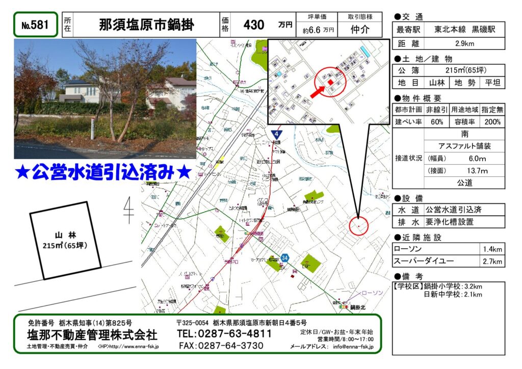 鍋掛北交差点(県道34号線)から1.4km。公営水道引込済みです。