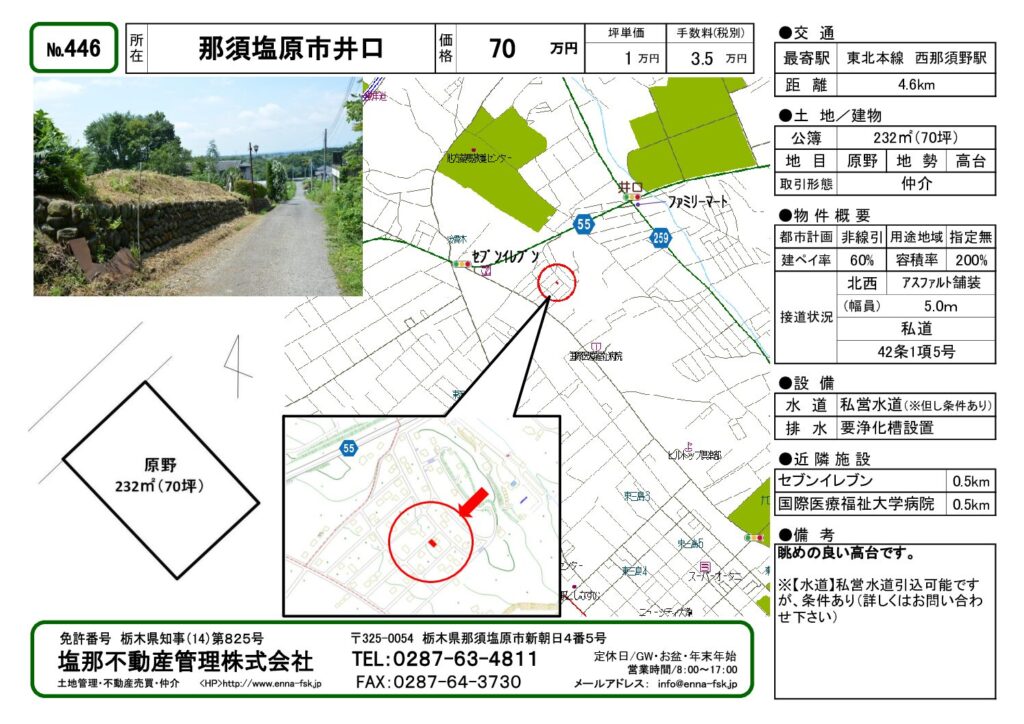 | 周辺環境 | セブンイレブン: 0.5km/ スーパーオータニ: 2.3km/ カインズホーム: 3.0km/ 国際医療福祉大学病院: 0.5km/ 西那須野塩原IC: 3.2km | ||