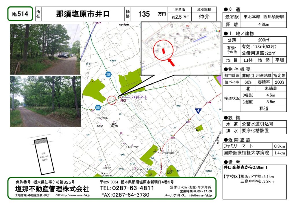 | カテゴリ | 売地, 井口, 那須塩原市学区, 那須塩原市(旧西那須野町), 槻沢小学校学区, 三島中学校学区 | タグ | |