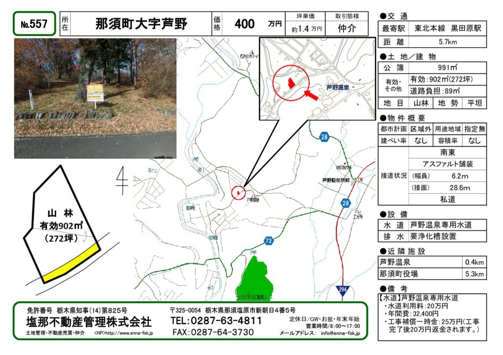 | 特記事項 | 【芦野温泉専用水道】■水道利用料: 200,000円■年間費: 32,400円■工事補償一時金: 250,000円(工事完了後20万円返金されます。) | ||