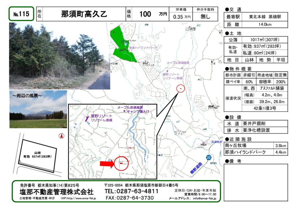 | 周辺環境 | 那須サファリパーク: 3.0km/ 南ヶ丘牧場: 3.8km/ ファミリーマート: 4.0km/ 那須ハイランドパーク: 4.4km/ 道の駅 那須高原友愛の森: 4.5km/ スーパーダイユー: 4.6km | ||