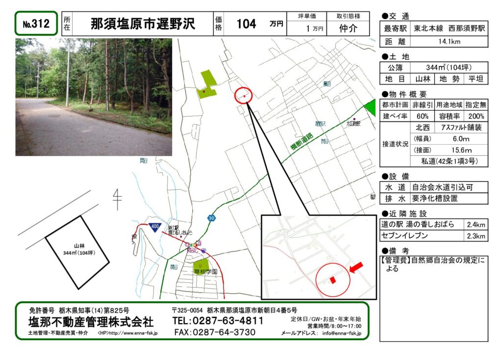 | 周辺環境 | 箒根学園: 2.7km/ セブンイレブン: 2.3㎞/ 道の駅 湯の香しおばら アグリパル塩原: 2.4㎞/ 塩原カントリークラブ: 3.1km | ||