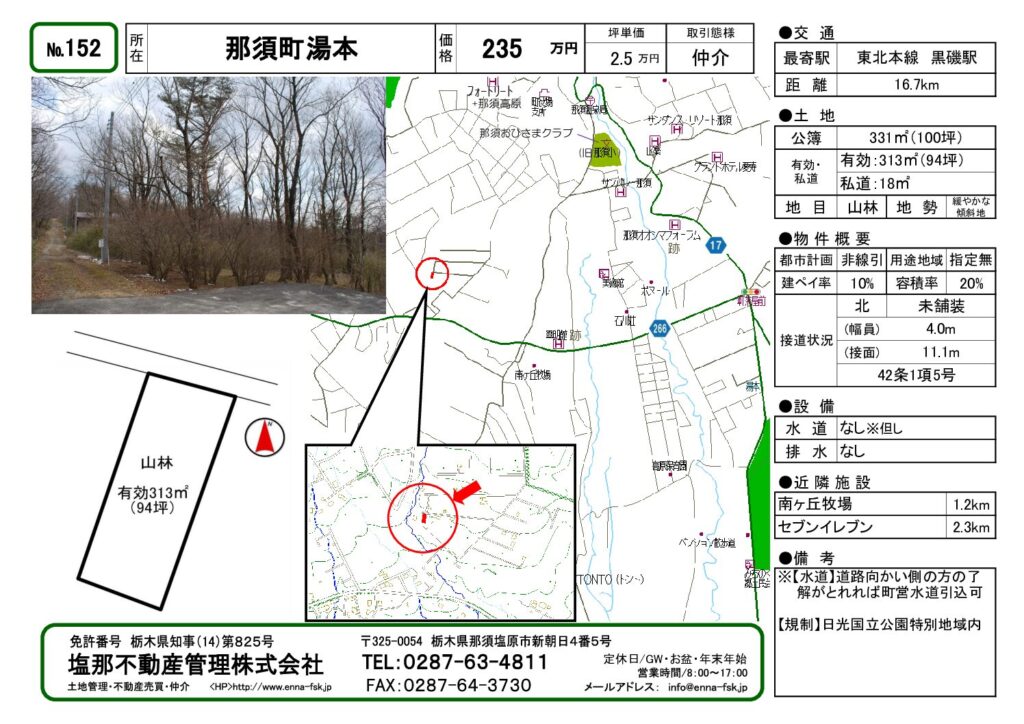 | 設備・条件 | 上水、下水なし(但し、道路向かい側の方の了解がとれれば公営水道引込可)緩い傾斜地【規制】日光国立公園特別地域 |
