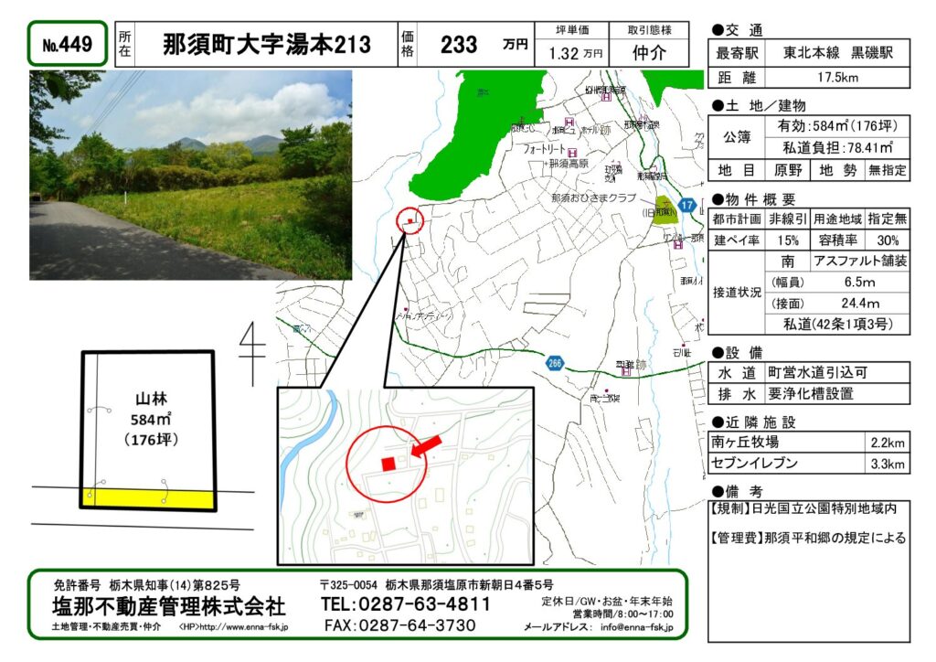 | 設備・条件 | 公営水道 水道: 町営水道引込可/ 排水: 要浄化槽設置 緩い傾斜地【規制】日光国立公園特別地域 |