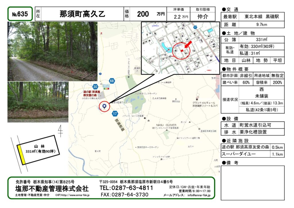 | 周辺環境 | 道の駅 那須高原友愛の森: 0.5km/ コメリ ハード&グリーン: 1km/ スーパーダイユー: 1.1km/ セブンイレブン: 1.9km/ カワチ薬品: 2.7km/ 那須IC: 4.9km | ||